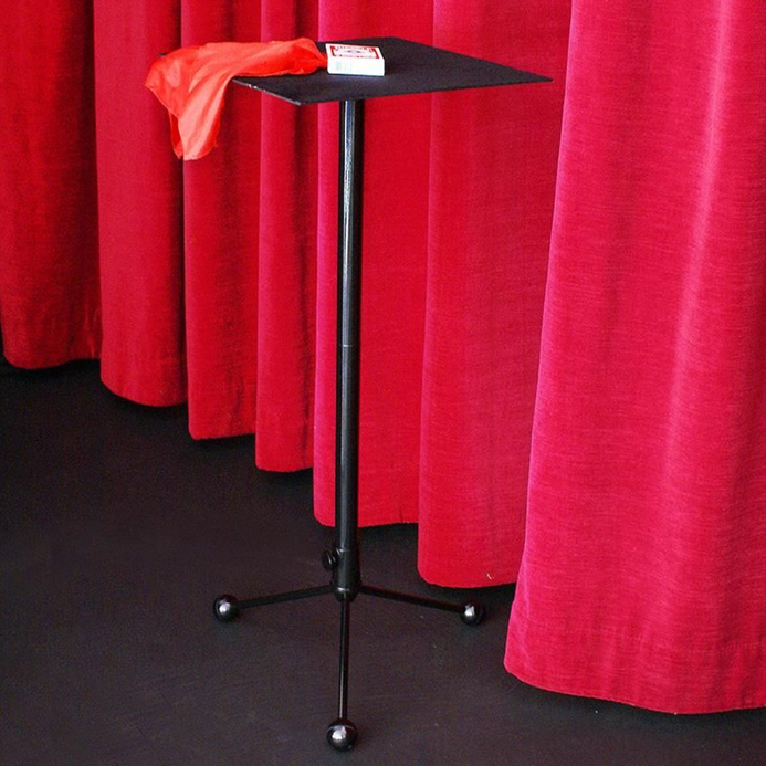 • The table is made of metal. It measures 81.8 cm (32.2 inches) high and the surface of the table, plastic, measures 35.5 cm (14 inches) on each side.