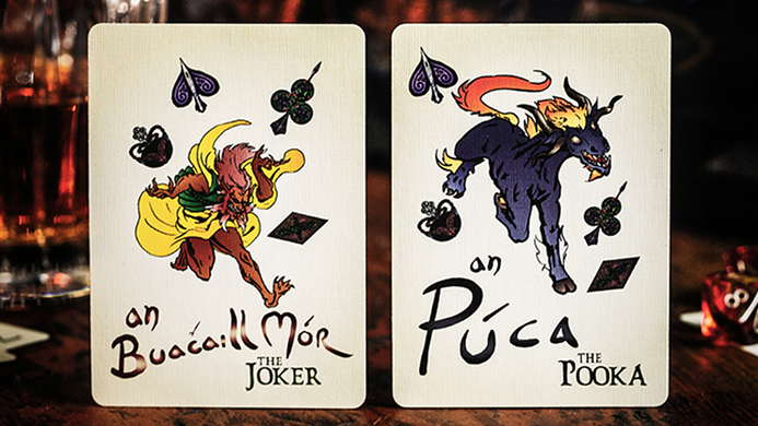 This is the official Deck of Celtic myth playing cards branded under the 'an Coire' name, the cauldron of authentic Celtic culture and tradition. Including informational cards on the source material for the images, this deck presents two figures from early Irish mythology on each face card and the Celtic Cosmology glyph as the artwork on the cards' backs. The Jokers are two of the mischievous land spirits of Celtic tradition: the Púca (Welsh Bwci whence the English "Boogeyman") and the Boggart famous from Scottish tradition. The Cosmology glyph on the backing shows the cauldron of poetic inspiration and sovereignty hearthed on the Newgrange front-stone at the base of a sacred otherworldly tree.