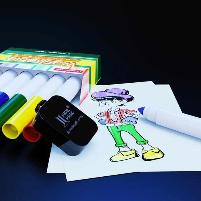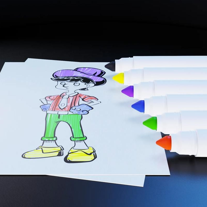 The magician stands back to the public while a member of the audience randomly chooses different color pens to create a drawing on a sheet of paper. Then, the magician turns around and reveals that the chosen colors correspond exactly to what he had predicted from the start.