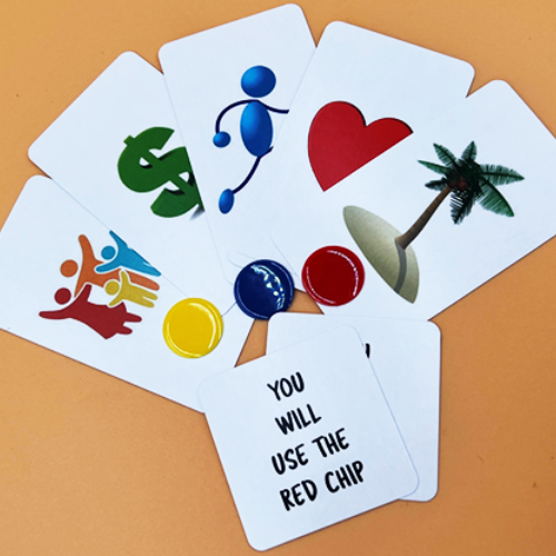 A color marker token is chosen (red, yellow or blue) and placed on one of the five cards that represent the subjects of concern on which people make decisions every day: travel, love, health, money and family.