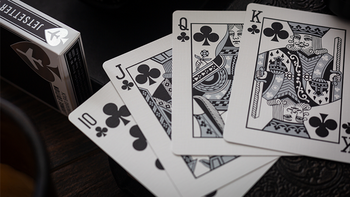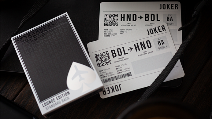 With the Standard Back version of the Lounge Edition in Tarmac Black, the playing cards showcase re-colored standard faces and have an untraditional offset classic and casino inspired back design that pays homage to the runways utilized by airlines across the globe with the black colorway. The cards are traditionally cut to provide the ability to weave or faro shuffle facedown. The tuck box exhibits premium features with a durable synthetic stock material, clear UV spot varnish, and silver foil accents.