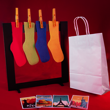 The magician shows a frame with 4 different colored socks hanging on it with clothespins. He shows the pairs of those 4 socks and places them in a paper bag. A spectator chooses one sock at random without the magician seeing it.