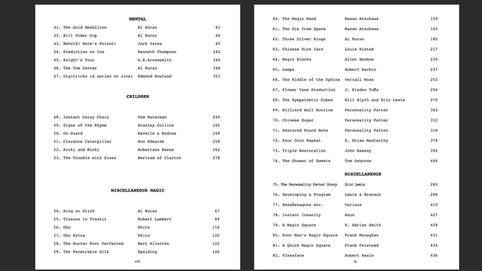 The 359 pages of this book contains 97 Effects for Close -up - Internship - Mentalism - Children, etc. Taken from Written Instructions and Books, to Watched Performances and Word of Mouth Instruction. Here are the Cherished Ideas of Annemann, Stanley Collins, Paul Curry, Cy Endfield, Robert Harbin, R.W. Hull, Stewart James, Jordan, Milton Kort, Ed Marlo, Clayton Rawson, Harlan Tarbell, Edward Victor and Many more.