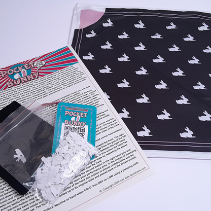 The specially designed pocket square measures approx. 13.5 inches x 13.5 inches (34 cm x 34 cm) and comes complete with a ton of tiny rabbit shaped confetti (which will be snapped up by your audience as a souvenir!) and a black carry pocket.