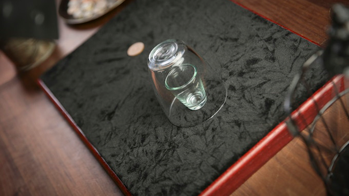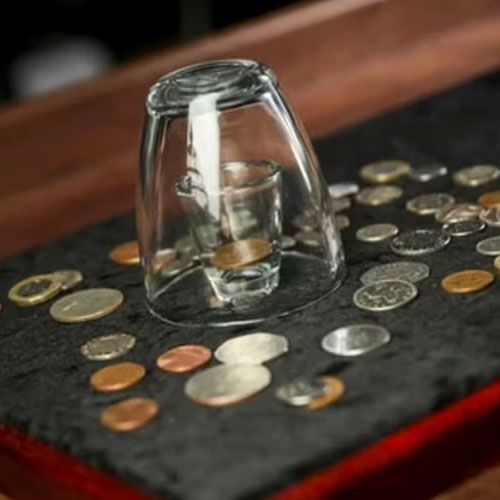 A coin, signed by a member of the public, disappears, then teleports suddenly and appears between two glasses in an instant, accompanied by the noise of the coins as if they fell from the air.