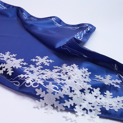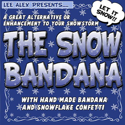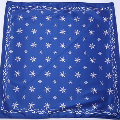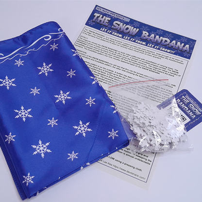 "A royal blue bandana with a white snowflake pattern and matching border is shown on both sides.The performer shakes the bandana, and the snowflakes fly off into the air.The bandana is shown blank on both sides, save the white border.The magician takes a handful of snowflake shaped confetti and throws these over the bandana. Alternatively, the bandana can be swept in the fallen confetti snowflakes.Once again the snowflake pattern appears on the bandana, and this can be shown on both sides as it was in the beginning."