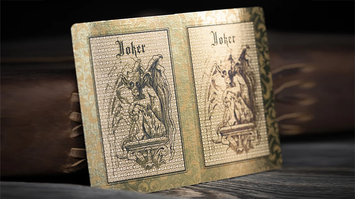 This technique, uncommon to playing cards, highlights the perfect detail within the art. Additionally these images are brought to life through sculpted embossing which brings an elegance to the deck worthy of these noble protectors sculpted upon medieval roofs and buttresses.