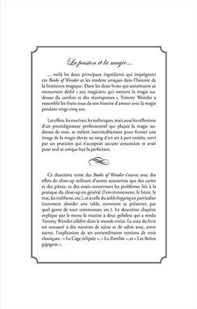 This second volume of Books of Wonder Opens with close-up effects using other accessories than cards and parts, and trials concerning problems related to the practice of close-ups in general (environment, noise, stage fright, troublemakers, etc.), and that of Table-Hopping In particular (how to approach a table, how to introduce yourself, by what kind of turn to start, etc.). The second chapter explains by the menu the routine with two cups which made Tommy Wonder famous worldwide. The rest of the book is devoted to stage and living room routines with, among other things, the explanation of its extraordinary versions of three classics: "The eclipsed cage", "The zombie" and "the leg boxes".