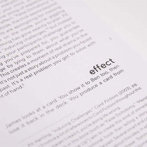 This book is divided into two main parts. The first presents Michael's favorite effects. These are routines that he regularly performs as part of his professional and occasional work. You will find innovative routines like "False Dichotomy", where two people seem to live the same card tour differently before the two realities prove to be true, as well as fun and offbeat versions of classics like Card Under Glass and Triumph.