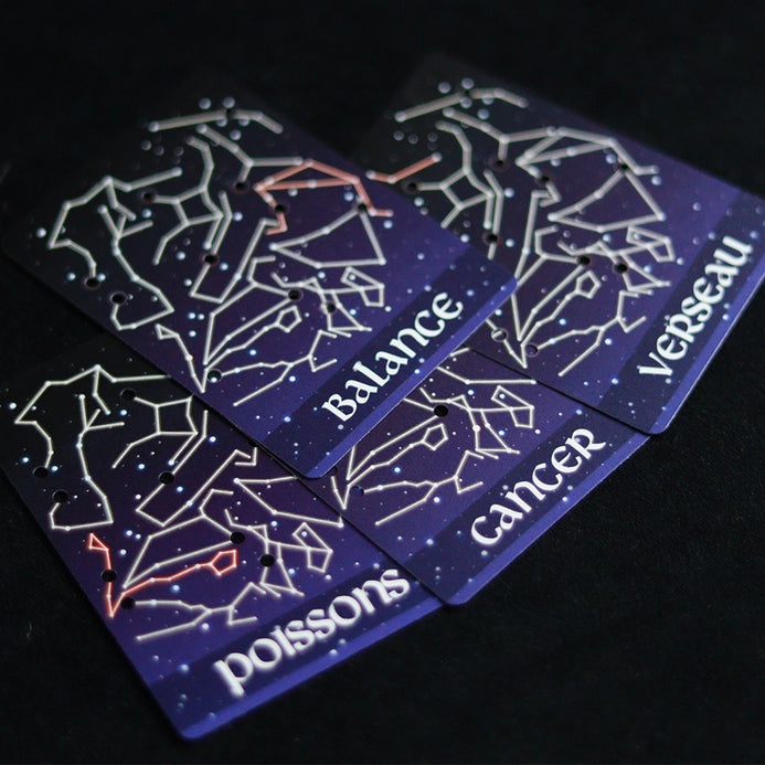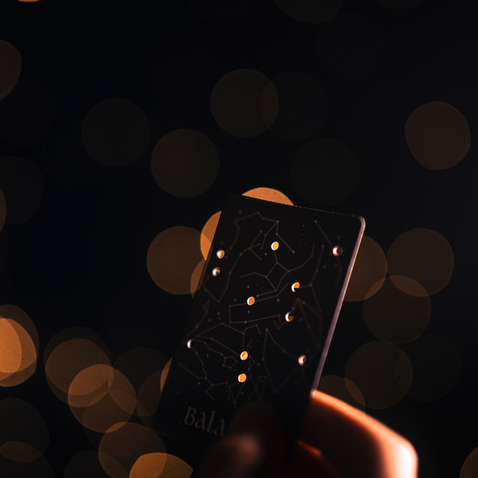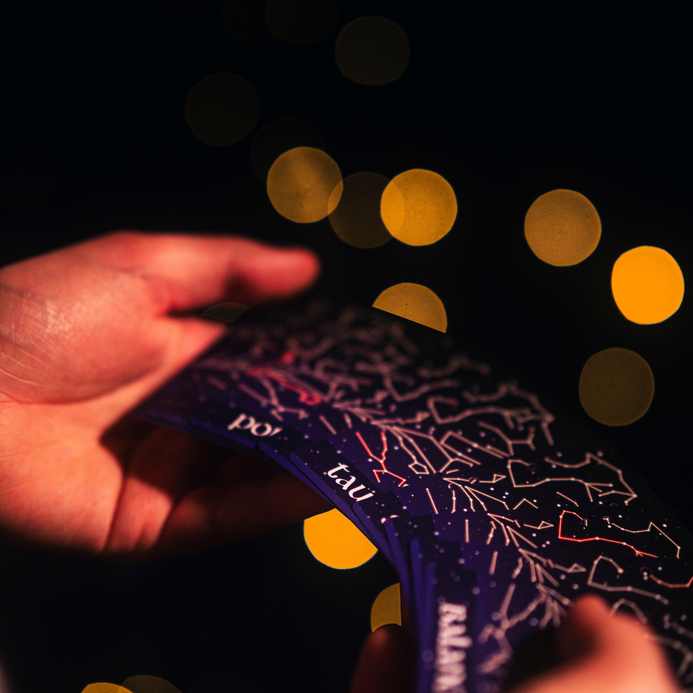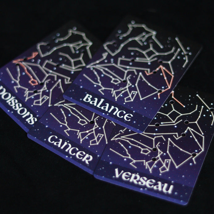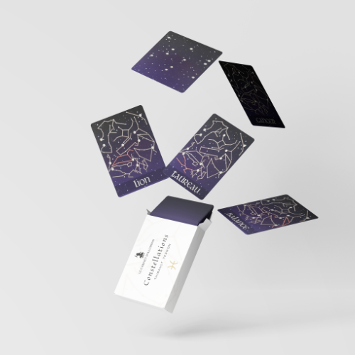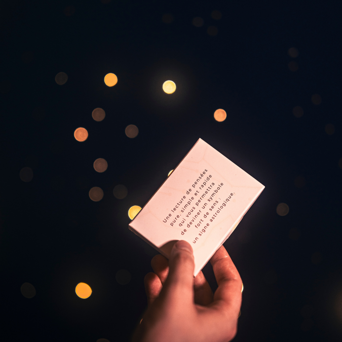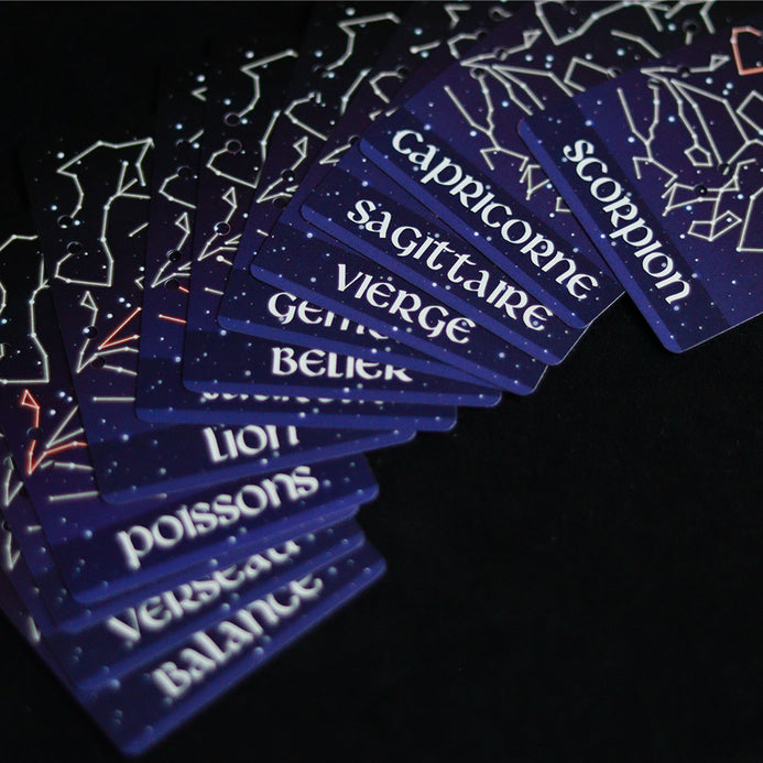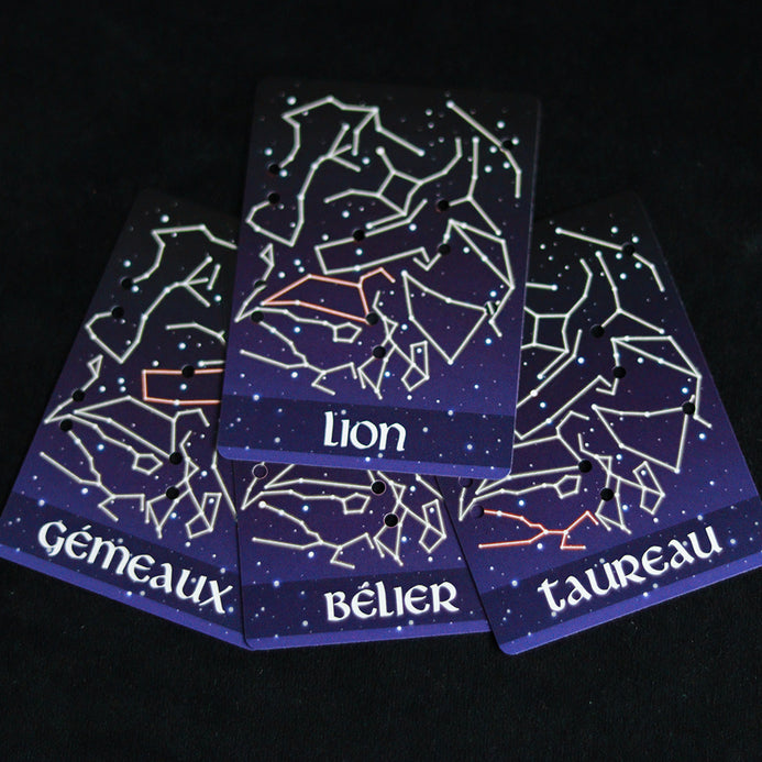 Twelve cards richly illustrated with astrological signs are presented. These cards were made in order to bring a real atmosphere, and their drawing was most careful to carry out an unforgettable experience. Holes are present to represent the stars so that you can add this poetic side by passing the flash of your phone behind the card and make the constellations shine.