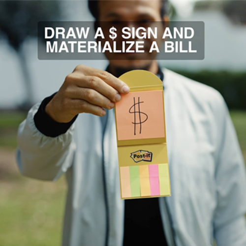 The magician draws on a post-it a sign of dollar, he gives a pichenette on the post-it and the written dollar sign turns into a real bank note. The ideal way to get money instantly!