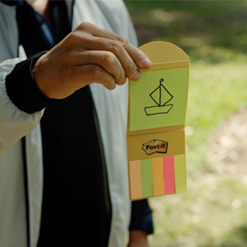 The magician shows different cards with different objects, one spectator chooses one, the magician concentrates and tries to guess the object chosen by drawing it on a post-it, when the magician shows what he has drawn, it seems to be A bunch of sticks oriented in different directions without too much sense, however, the magician triggers the Flick-it block and in a very visual way all these sticks form together the drawing of the chosen object: a boat, a car, a toy, a puppet, etc ... etc ...