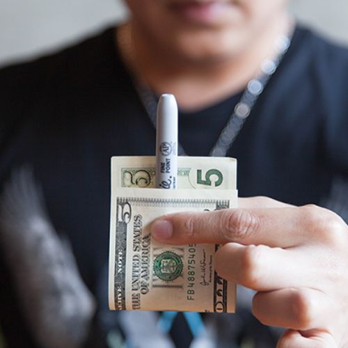 The magician borrows a ticket and puncture him with his Sharpie.