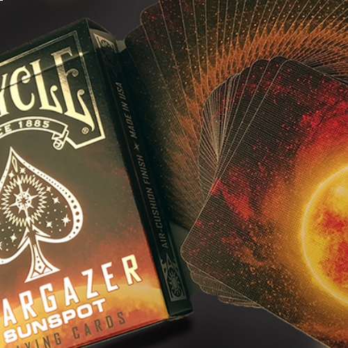 Bicycle playing ® Stargazer Sun Spot Bicycle Cards presents the vibrant colors of the star in the center of our solar system known as the sun. The design of the back of the card with a shine of yellow and fire will certainly delight. The storage box gives life to the dynamism of the sun with a leaf of reflective silver. The back and faces of the cards are inspired by the yellow-orange light of the sun.