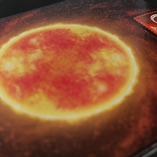 The back and the faces of the card are inspired by the swirling clouds which revolve around a black hole