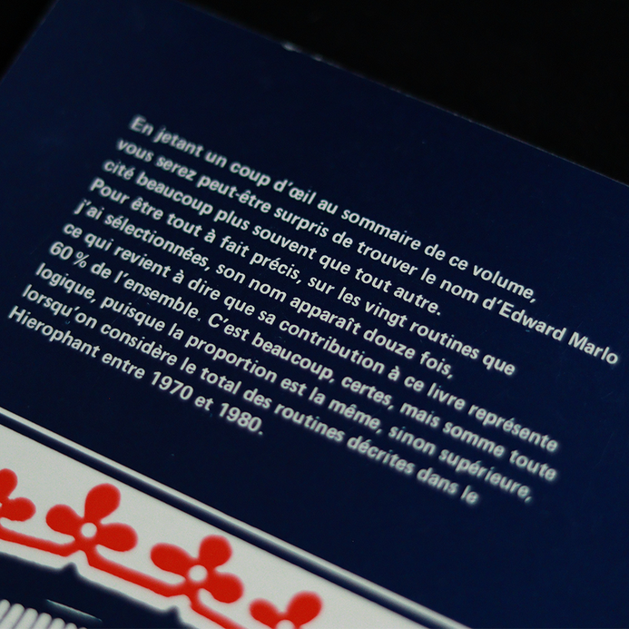 Published by Juman Recherbaumer between 1970 and 1980, this magazine exclusively reserved for the magic of the cards (with the exception of one or two micro-magic routines for all the eight numbers published) was at the time one of these avant-garde reviews which, with Ibidem, Pallbearers' Review, Kabbala And Epilogue, made a wind of renewal blow in the world of cartomagic. By taking a look at the summary of this volume, you may be surprised to find the name of Edward Marlo cited much more often than any other. To be completely precise and to avoid making calculations, on the twenty routines that I have selected, the name Edward Marlo appears twelve times.