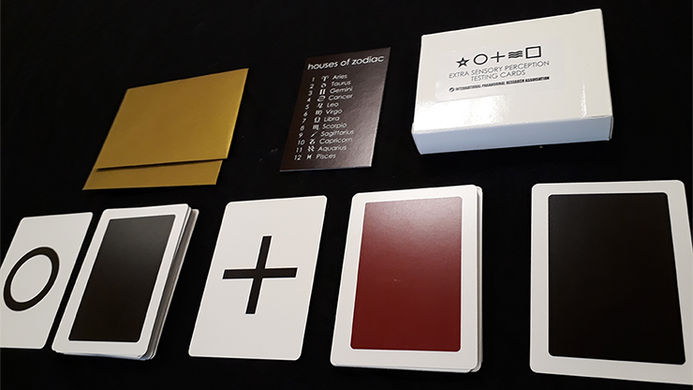 The box of the "International Paranormal Research Association" contains two complete ESP or Zener card games. A red back game and an original black back game. The new cards have been printed according to the strictest standards by the US Playing Card Company, which gives them an exceptional appearance and touch. Inside your game, you will also find a selection of additional cards and false cards, which will offer you more creative possibilities than with any other ESP game on the market.