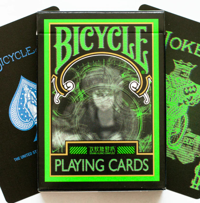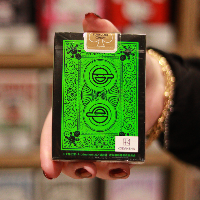 Dans cette nouvelle version, l'étui et les cartes rendent hommage à l'univers cybernétique de Ghost in the Shell SAC, avec des détails complexes tels que le camouflage optique qui orne les valets, les dames et les rois.