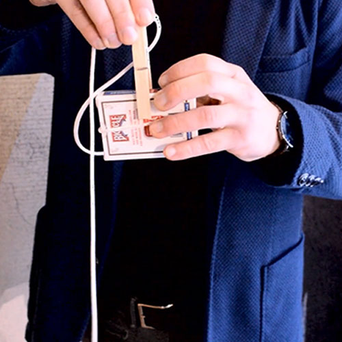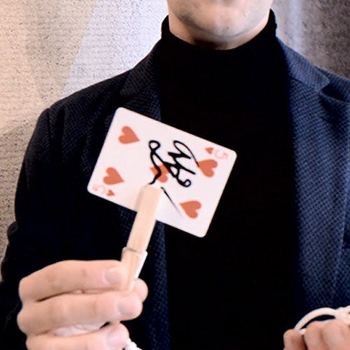 La boîte est jetée vers le bas en tenant le bout de la ficelle et à la fin, la carte signée sortira de la boîte en restant dans la prise de l'épingle à linge, alors que le jeu est encore fermé.