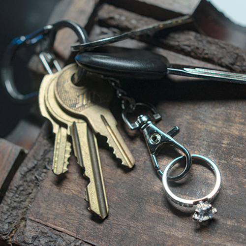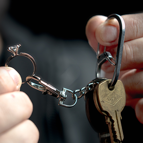 Vous empruntez une bague et la placez dans votre main gauche. Vous montrez ensuite clairement que votre main droite est vide, vous fouillez dans votre poche, vous en sortez vos clés et vous les donnez au spectateur en guise de garantie. Maintenant, écoutez ceci : vous faites disparaître et réapparaître instantanément la bague sur une courte chaîne reliée aux clés que votre spectateur tient dans ses propres mains.