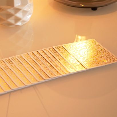 La boîte est composée de deux enveloppes de protection blanc nacré, avec une enveloppe intérieure et extérieure en cellophane. Ces cartes dorées individuellement sont scellées pour résister à toute chaleur ou humidité extrême pendant l'expédition. Notre priorité pour la série Regalia a toujours été la qualité. Chaque carte a été soigneusement estampée à chaud avec une feuille d'or, puis protégée par une véritable finition B9, afin de ne pas compromettre la sensation et la fluidité à chaque mélange ou fioriture.