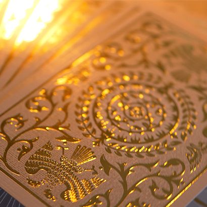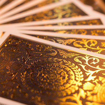 Chaque carte est fabriquée avec le meilleur papier de lin écrasé en Belgique et la feuille d'or a été développée et produite en interne selon les normes les plus strictes par Cartamundi.