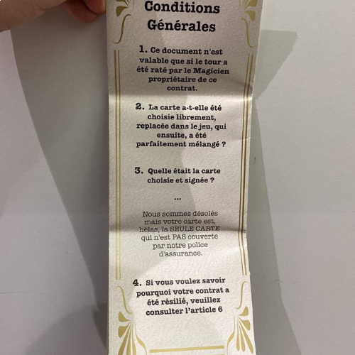Le magicien ne parvient pas à trouver la carte signée, il décide donc d'utiliser son assurance pour réparer son erreur. Il ouvre la police d'assurance pour voir s'il est couvert pour cela, et après beaucoup de comédie, il trouve finalement la carte signée à l'intérieur de l'enveloppe d'une manière complètement impossible.